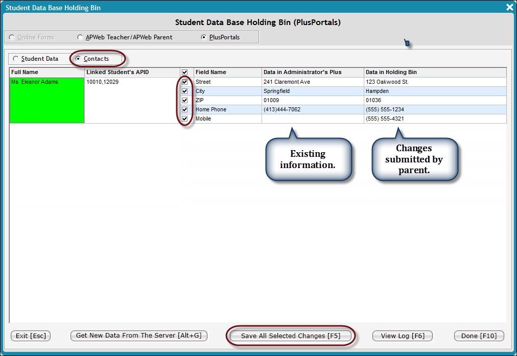 In the holding bin, click the Contacts option, select any changes you wish to receive, then click the Save All Selected Changes button. Once the changes have been received, click the Exit or Done button. A brief sync will occur, sending the updated information up to the PlusPortals.