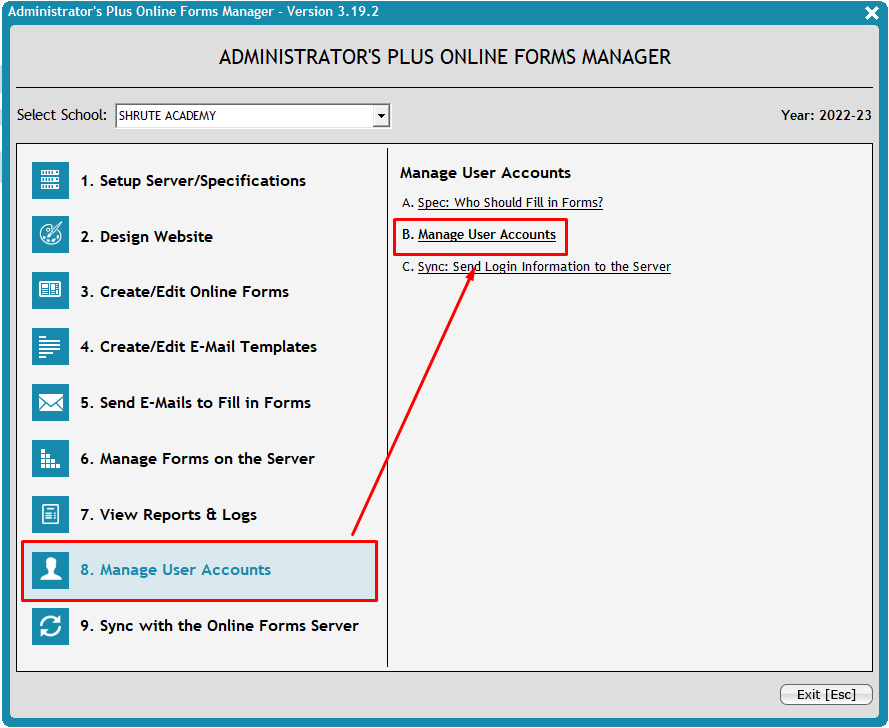 1. Go to Tools > Online Forms Manager > 8B. Manage User Accounts.