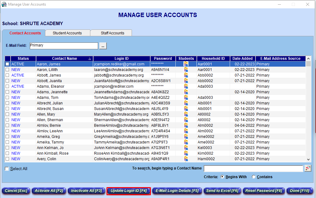 2. Use the Update Login ID function to ensure that contact user accounts are all using the most up to date email address populating their Primary Email field.