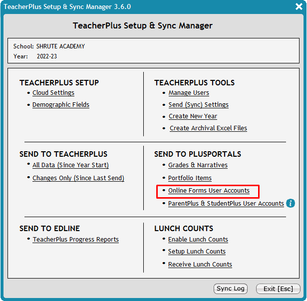 4. Go to Tools > TeacherPlus Setup and Sync Manager. Run an Online Forms User Accounts sync. This will link your contacts' Online Forms accounts that we just updated with their existing PlusPortals account. Once completed, run an All Data (Since Year Start) sync.