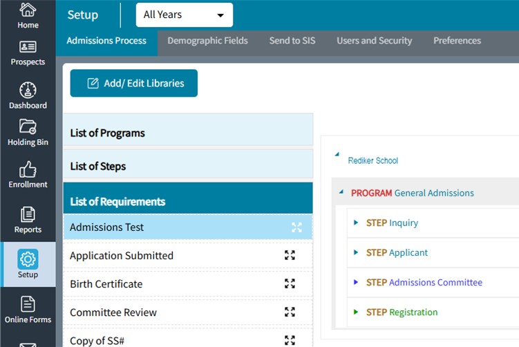 A Program groups prospective students together within the same grade level with the same list of requirements. A group of prospects within the same grade level with a different list of requirements would qualify for an additional program. For example: International students would have different requirements than domestic students. Boarding students would have different requirements than day students.