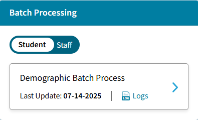 - Student Demographic Import: Existing Student data can be batch updated with the Student Demographic Import. Select Logs to view the logs for past imports.