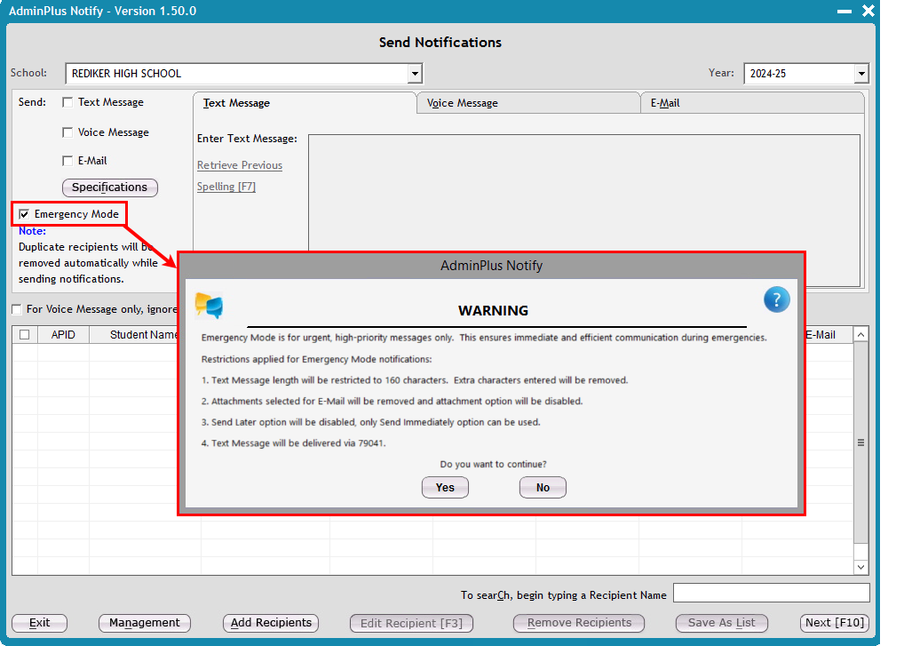 In the case of an emergency at your school, the Emergency Mode feature in AP Notify enables users to designate certain urgent messages as high priority by selecting the Emergency Mode option. No individual recipients allowed. You must send these messages to a group of recipients.
