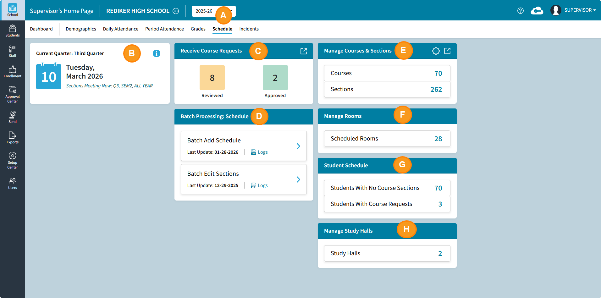E | The Manage Courses & Sections tile displays the count of active courses and sections. Click on the number to see detail or click expand For more information, see School Schedule: Manage Course & Sections. |