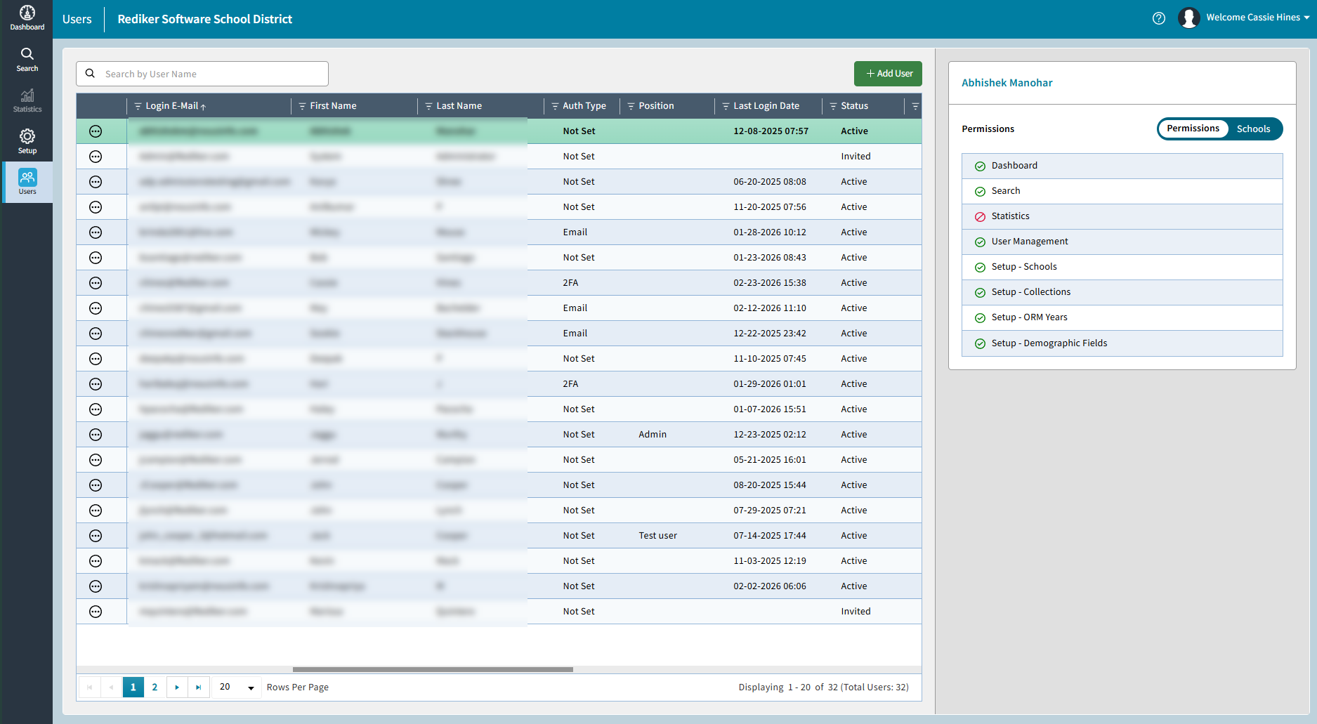 If the user should only have access to certain schools, select only those schools.Ensure the Email User option is checked. This will send an email to the new user with instructions to set a password and log in.
