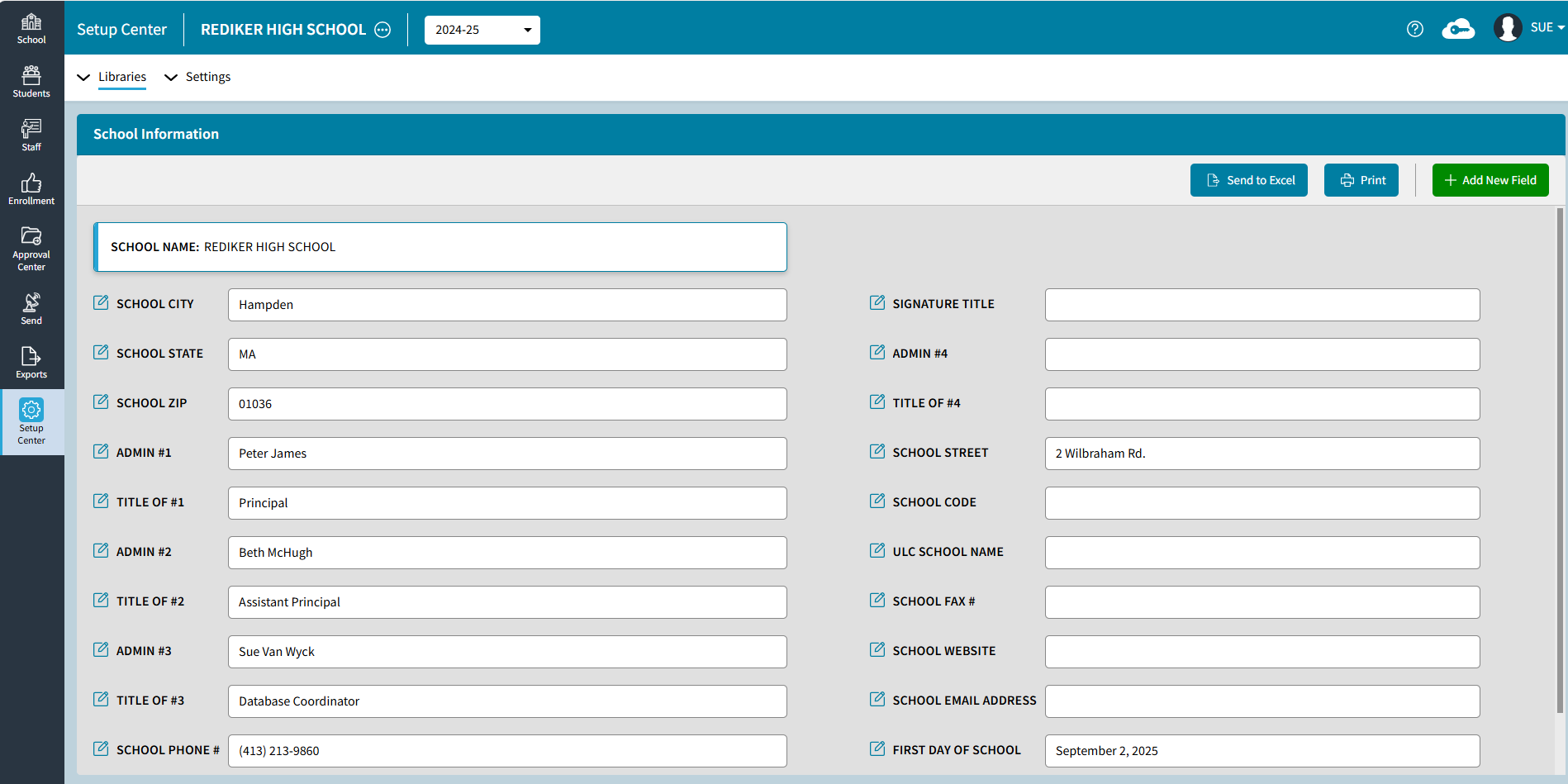 Setup > Libraries > School Information, is used to define School Information fields and their values. The same screen can also be access by expanding the School Information tile on School > Demographics. Users with All rights to Demographics can Add New Fields and Edit existing fields if the school has selected to edit Demographics in AdminPlus.com.
