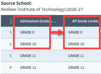Because we are mapping the 26-27 school year, this screenshot shows that prospects applying for grade 2 for the 26-27 school year in Admissions will be sent to grade 2 for the 26-27 school year in Administrator's Plus.