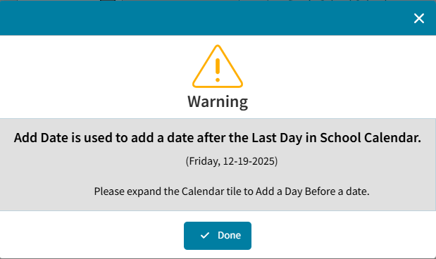 that opens Calendar to manage school days. Add Date is used to add a date after the Last Day in School Calendar, to Add a Day Before a date, expand to navigate to the Calendar. For more information see, Add a Day to the Calendar Before or After an Existing Day.