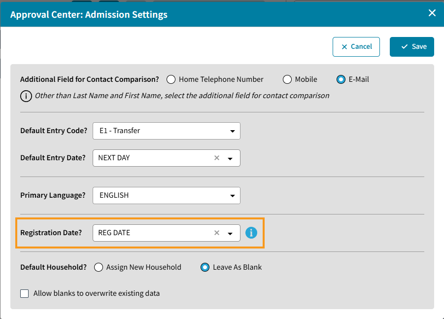 Approval Center: Admissions Settings now includes an option to specify a custom demographic date field to store the Registration Date.