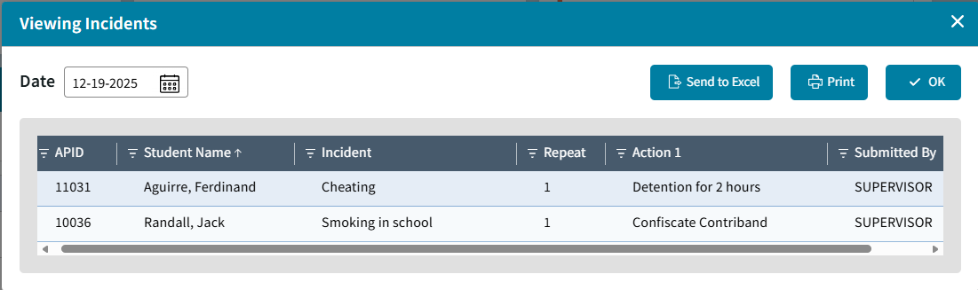 Click on Today's Incidents count to View Incidents detail for the selected date, Send to Excel, or Print.