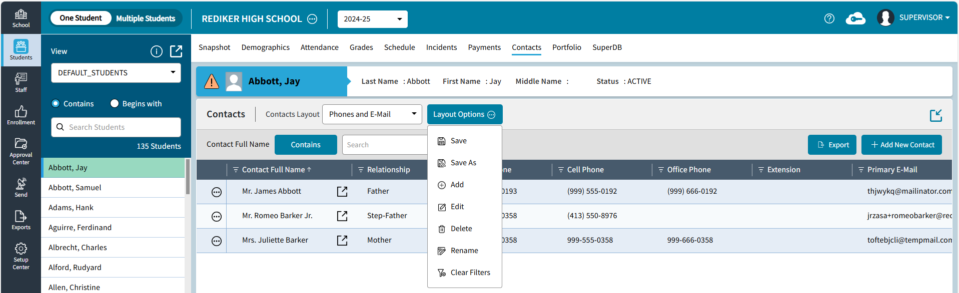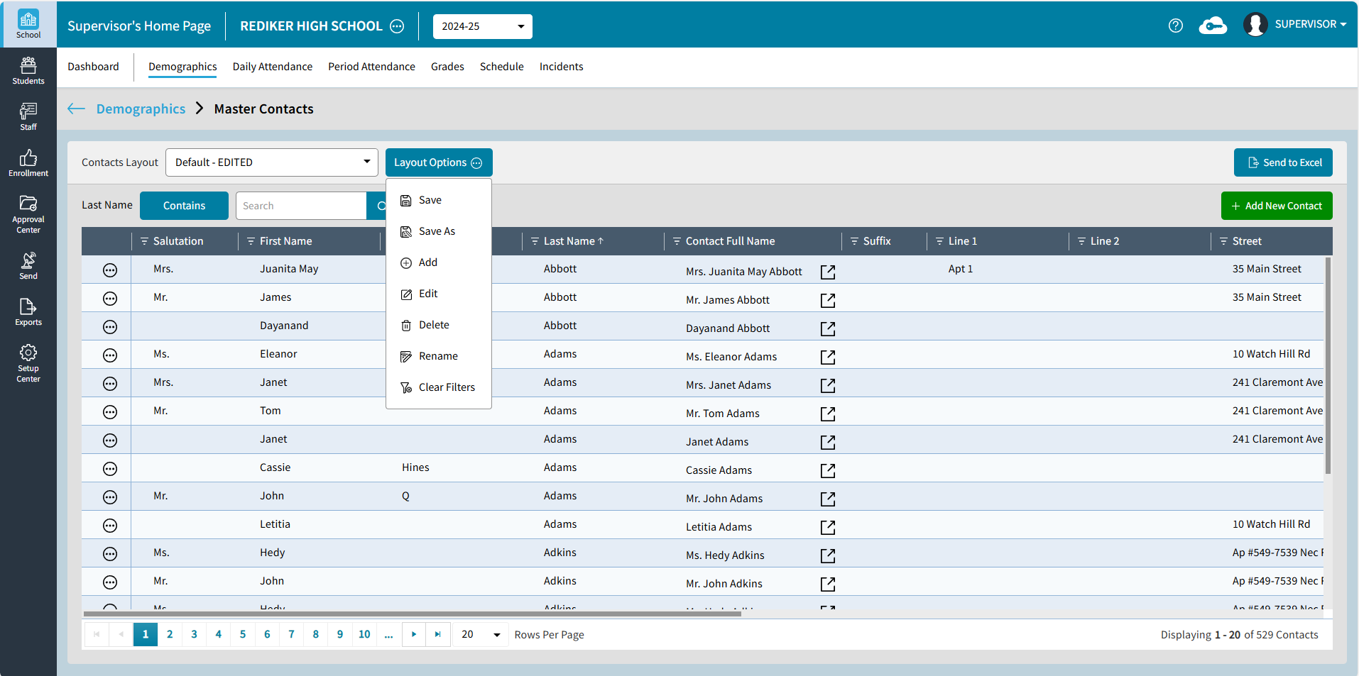 The Default Layout is sorted by Contact Full Name, if a different sort such as Last Name is selected the Layout Name will change to Default - EDITED. To save an edited version of Default choose Save As. Master Contact Layouts are shared within your school so contacts you create are available to other users with access to Contacts.