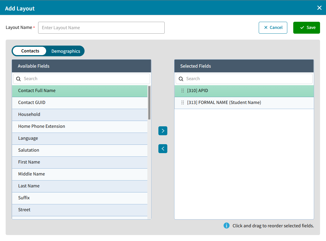 Click Add to create a new layout. Enter a Layout Name and select fields from Contacts or Demographics. The Available Fields for Contacts includes the Local Fields which apply to the contact for that student. The APID and FORMAL NAME (Student Name) will be listed by default for reference, but they can be removed. Additional Student Demographic fields can be added from the Demographics tab.