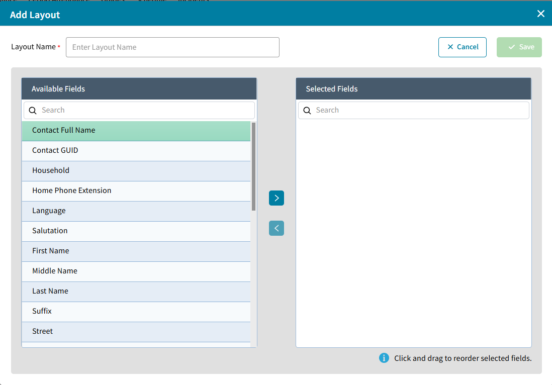 Click Add to create a new layout. Enter Layout Name and select from the Available Fields which include the Global Contact fields only.