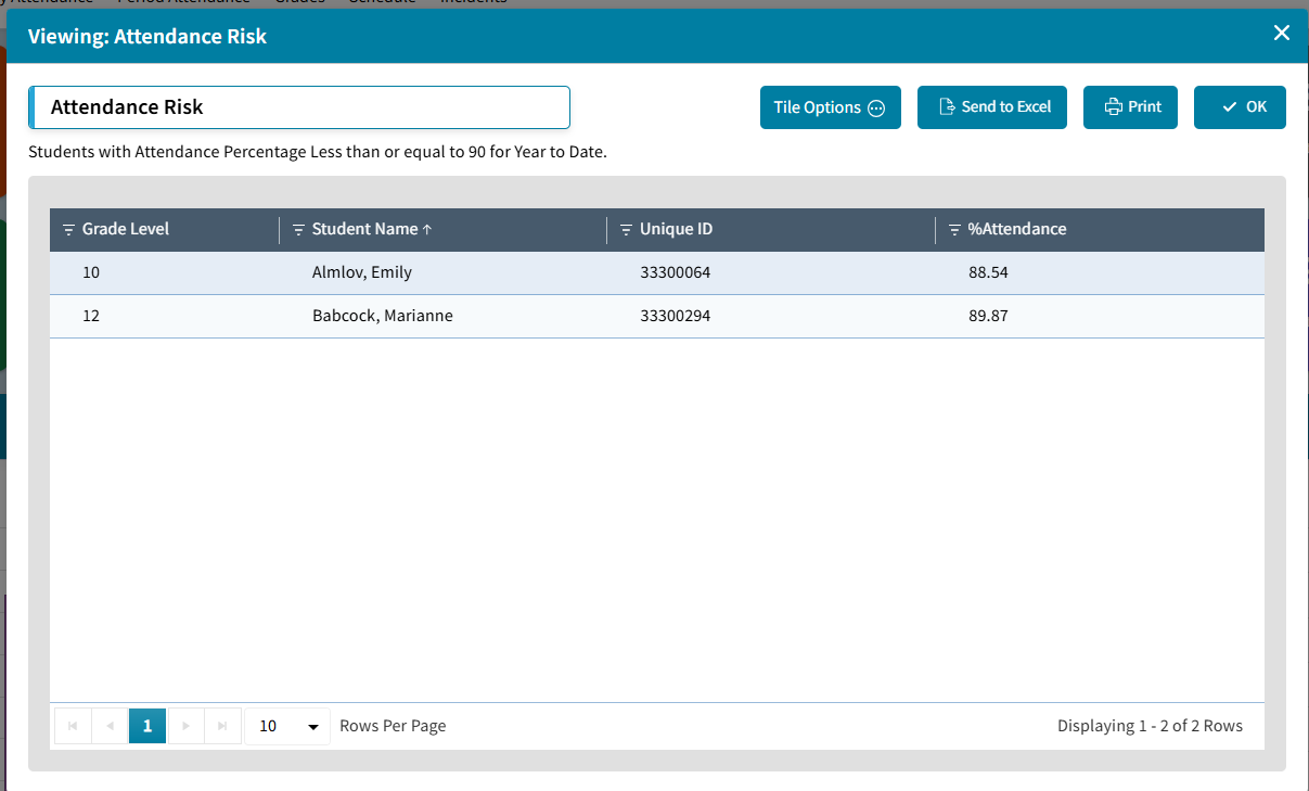 An Attendance Risk tile has been added to the Dashboard Library. This Attendance Totals Search Limit widget type is set to get the count of Students that have less than 90% Attendance Rate Year-to-date. Click on the count to see the detail (Grade, Student Name, ID Number selected in User Preferences, and the Amount for Search selected.