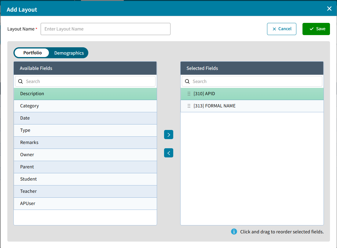Student and Staff Portfolio Layouts can now be managed in AdminPlus.com independently from the Student and Staff Portfolio Views in classic. They can be accessed from One or Multiple Portfolio and are shared by all users in the school. The APID and FORMAL NAME (Student Name) will be listed by default for reference, but they can be removed. Additional Student Demographic fields can be added from the Demographics tab.