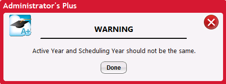 A validation has been added to Current and Scheduling Year Specifications to warn users that the Active Year and Scheduling Year should not be the same.