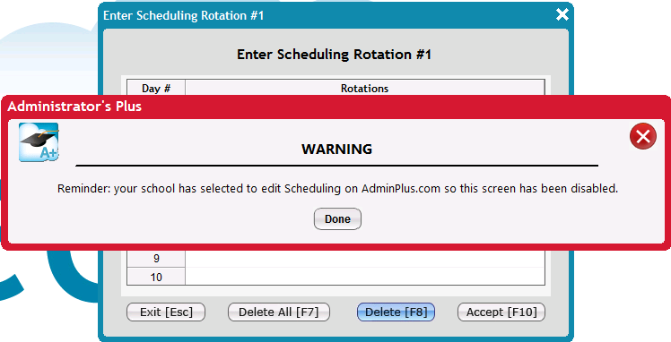 Setup Scheduling options to edit Block Rotations, Day of Week Headings, and Block Meeting Times are restricted for schools that have selected to edit Scheduling in AdminPlus.com. The information can be viewed but not edited. For more information about the feature in AdminPlus.com see Setup Center: Block Rotations.