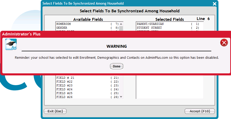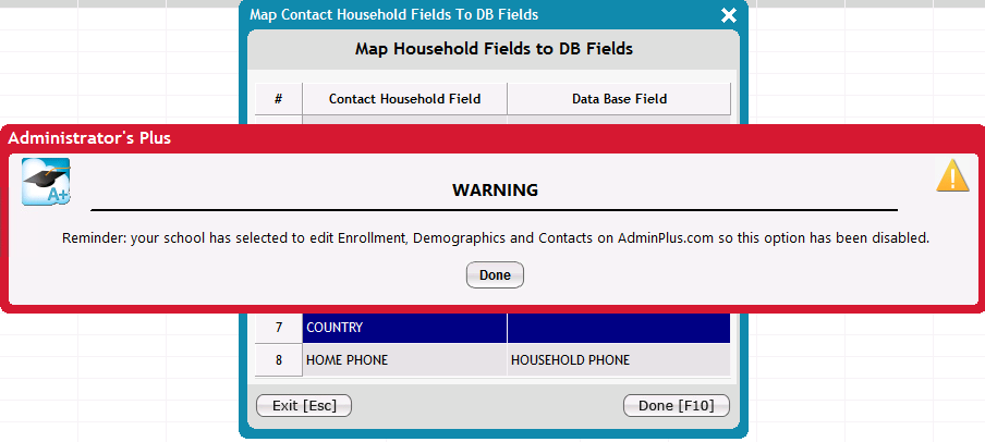 The Household field selection and Mapping of Household Fields to DB fields in classic is restricted for schools that have selected to edit Enrollment, Demographics, and Contacts in AdminPlus.com. This can now be done in AdminPlus.com, for more information see Setup Center > Settings > Households Fields.