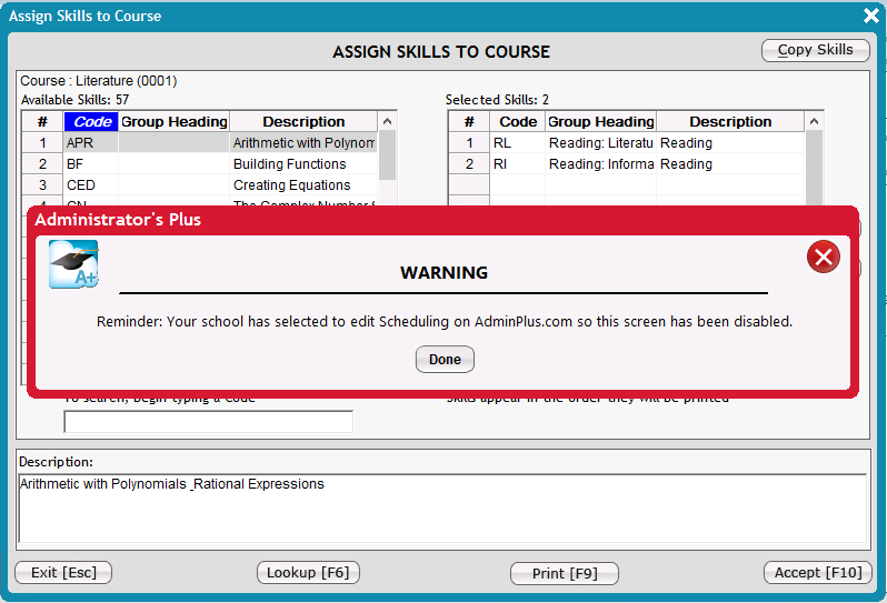 The Course > Skills (Assign Skills to Course) screen can be viewed and printed; however, the edit functions are restricted in classic. For more information about the feature in AdminPlus.com see School: Schedule Manage Courses & Sections > Linked Skills.