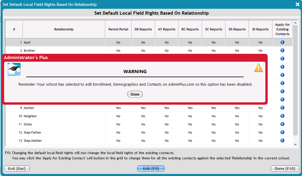 Set Default Local Field Values Restricted can be viewed but edit has been restricted for schools that have selected to edit Enrollment, Demographics, and Contact in AdminPlus.com. This functionality has been added and renamed in AdminPlus.com, for more information see Default Contact Access Permissions.