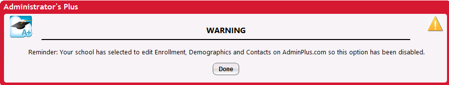 Setup Student Contacts Address Fields can be viewed but edit for schools that have selected to edit Enrollment, Demographics, and Contact in AdminPlus.com has been restricted. A reminder will come up before opening the screen. This functionality is in AdminPlus.com Setup Center, for more information see Setup Center: Contact Address Layout.