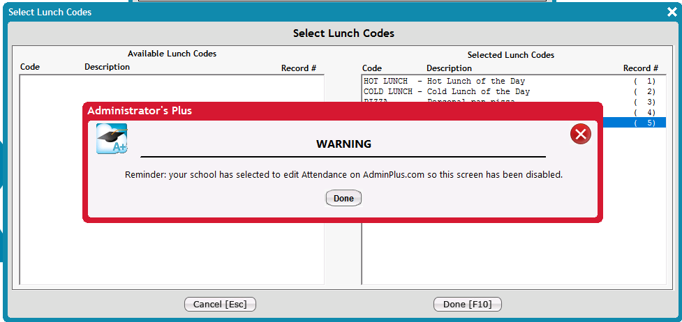 Add/Edit Lunch Codes is restricted for Schools that are editing Attendance in AdminPlus.com. This functionality has been added to AdminPlus.com, for more information see Setup Center: Lunch Codes.