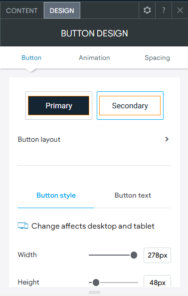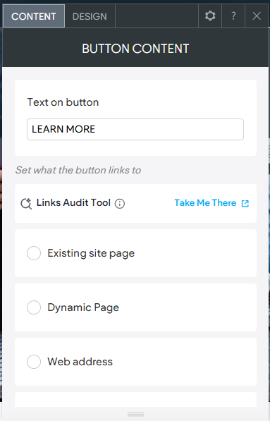 Widgets generally have 2 components to them: Content and Design. When you add a new widget to a page or edit an existing one, you are presented with editing either the content or the design of the widget. The exception to this, is the text widget which uses a standard rich text editing tool bar. The options found under Content and Design will vary by the widget being used. For example, a Button Widget only has 2 items for Content, the Text and the Link. Whereas a Photo Gallery Widget, has Images in the Content area, and each image would have other content properties like Title, Description, Button Text, etc. making it far more complex than a simple Button.