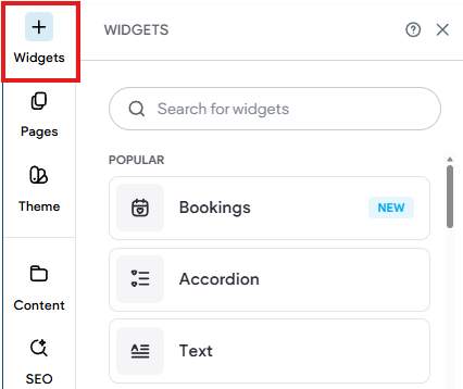 Widgets are drag and drop features that are used to display content on your website. Widgets are found in the Widget Panel accessed from the Left sidebar in the Editor.