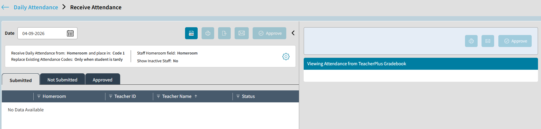 On the Receive Attendance screen, you will see the active date, receive settings, and tabs for the sections of attendance data from the teacher gradebooks (Submitted, Not Submitted, Approved).