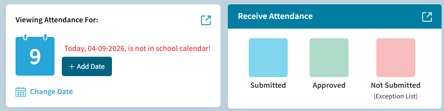 The displayed number of Submitted, Approved, and Not Submitted sections of attendance data is only available when viewing a day on the school calendar. If no data appears in the Receive Attendance tile, then you have likely not created today as a date in the school calendar. This would be indicated in the Viewing Attendance For tile.