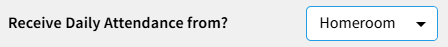This field is only used to allow for an alternative field name for the Homeroom "label" or name appearing on this screen. The standard Homeroom Field (Field #9) is and remains the only field that actually creates a Gradebook for the staff to take daily attendance. Using this option simply changes the Homeroom Title that the Receive Attendance screen displays. If you set the Receive Daily Attendance From option to Homeroom, then you can use this setting to choose a new field, and the value in this field will be used as the displayed homeroom name. It does NOT change the source of the data (Homeroom Field and Homeroom Gradebook).