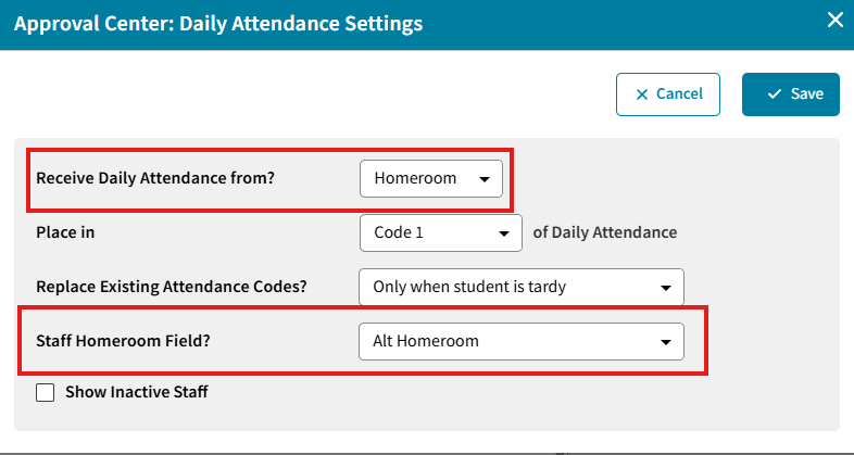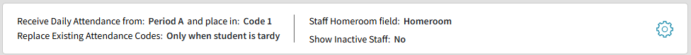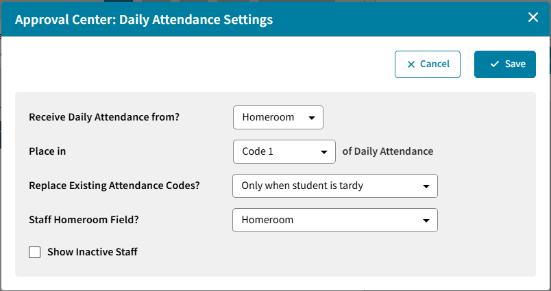 Click on the Gear icon on the right side to access and change these settings. That will open the Approval Center: Daily Attendance Settings (as noted at the top of this article, Daily Attendance is a shared screen with Approval Center and displays the same data and settings).