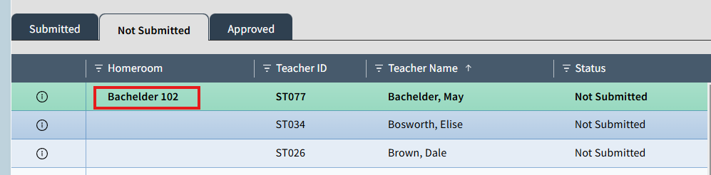 Displays the Homerooms or Section for which the teacher has NOT submitted their Daily Attendance marks. These are sections that the system is expecting to receive Daily Attendance from, but the teacher did NOT click submit. You may select a Not Submitted section and preview marks a teacher has made in that gradebook, however, you cannot approve attendance from a Not Submitted gradebook.