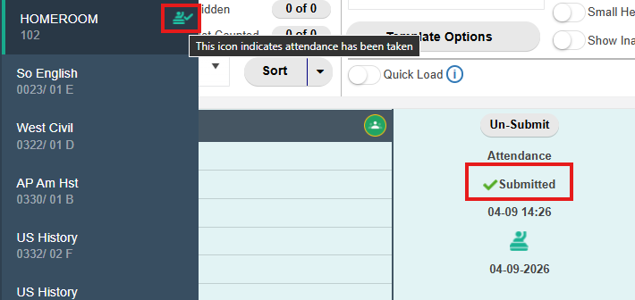 Initially all homerooms or sections of attendance data will appear under either Submitted or Not Submitted based on whether the teacher has clicked Submit in the appropriate Gradebook for the day's attendance. In the teacher's gradebook the displayed attendance column would show as Submitted as well as an icon in the Gradebooks menu to indicate attendance has been taken and submitted.