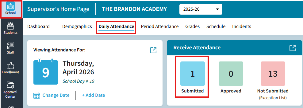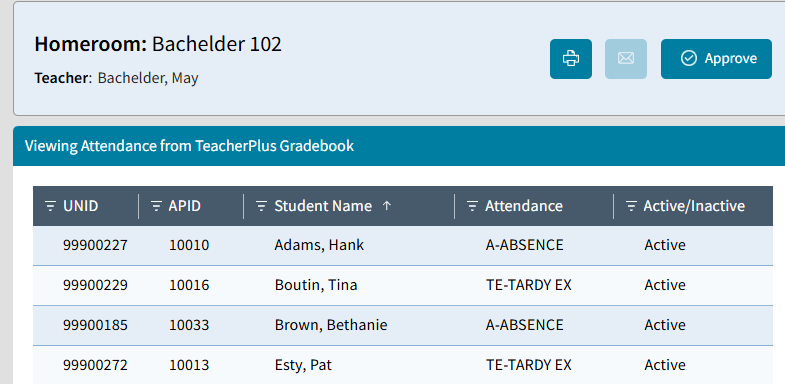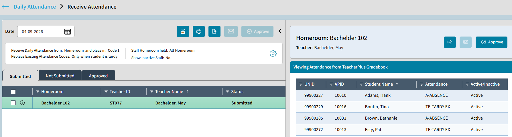 Both the Receive Attendance tile on the School: Daily Attendance screen and the Receive Attendance screen, display the same information contained in the Approval CenterOnly schools that use Rediker's TeacherPlus Gradebooks and require teachers to submit daily attendance from their gradebooks, will use this feature. This feature is not for importing attendance data from another platform or for entering attendance entries.