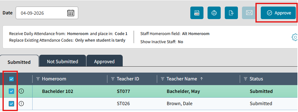 On the left side of the Receive Attendance screen on the Submitted tab you can use the checkboxes to select Homerooms/Sections you wish to approve or use the top check mark in the column header to select all. Then click the Approve Button to approve all selected Homerooms or Sections at once.
