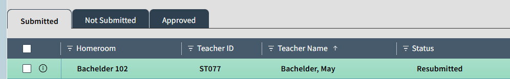 Please note that once you have Approved a Submitted Homeroom or Section there is no way to un-approve it. Teachers may choose to re-submit from their gradebooks, or you may review and manually edit marks on the Enter Student Daily Attendance screen. When teacher re-submits their gradebook attendance, it moves the homeroom or section from the Approved to the Submitted tab with a status of Resubmitted, the Receive Attendance tile will also display this as a number under the Submitted totals.